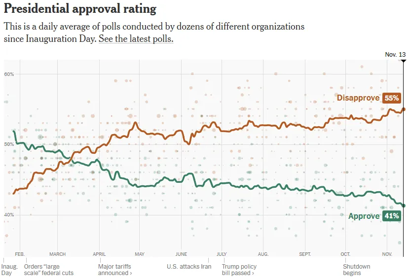Після виборів штаб Трампа спробував пояснити поразку "локальними проблемами" та низькою явкою, однак опитування показали інше. Рейтинг схвалення президента вже коливається в районі 40 % – навіть серед незалежних виборців, які ще недавно підтримували його заради "економічної стабільності", але замість цього побачили зростання цін і політичну турбулентність.