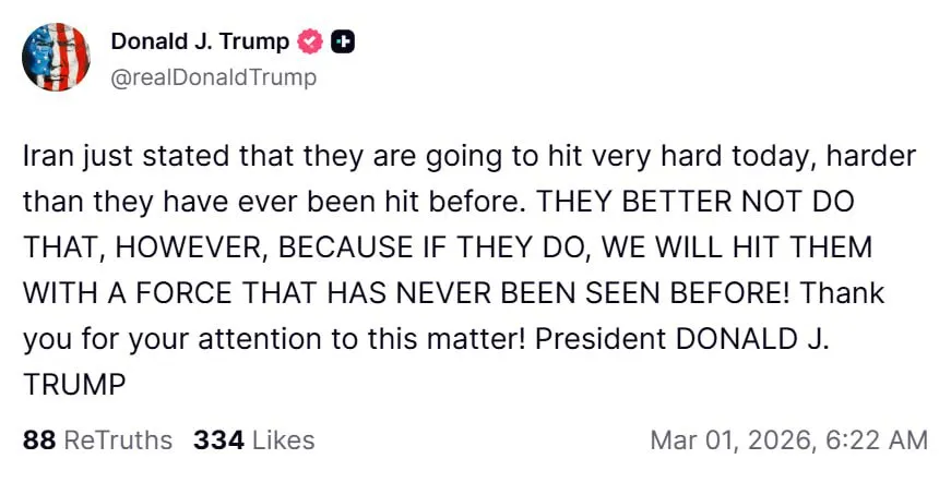 На такі заяви від іранської сторони оперативно відреагував президент США Дональд Трамп. У своєму дописі в мережі Truth Social він застеріг Іран від подальшої наступальної операції словами "краще б вони цього не робили", інакше – США "вдарять небаченою раніше силою".