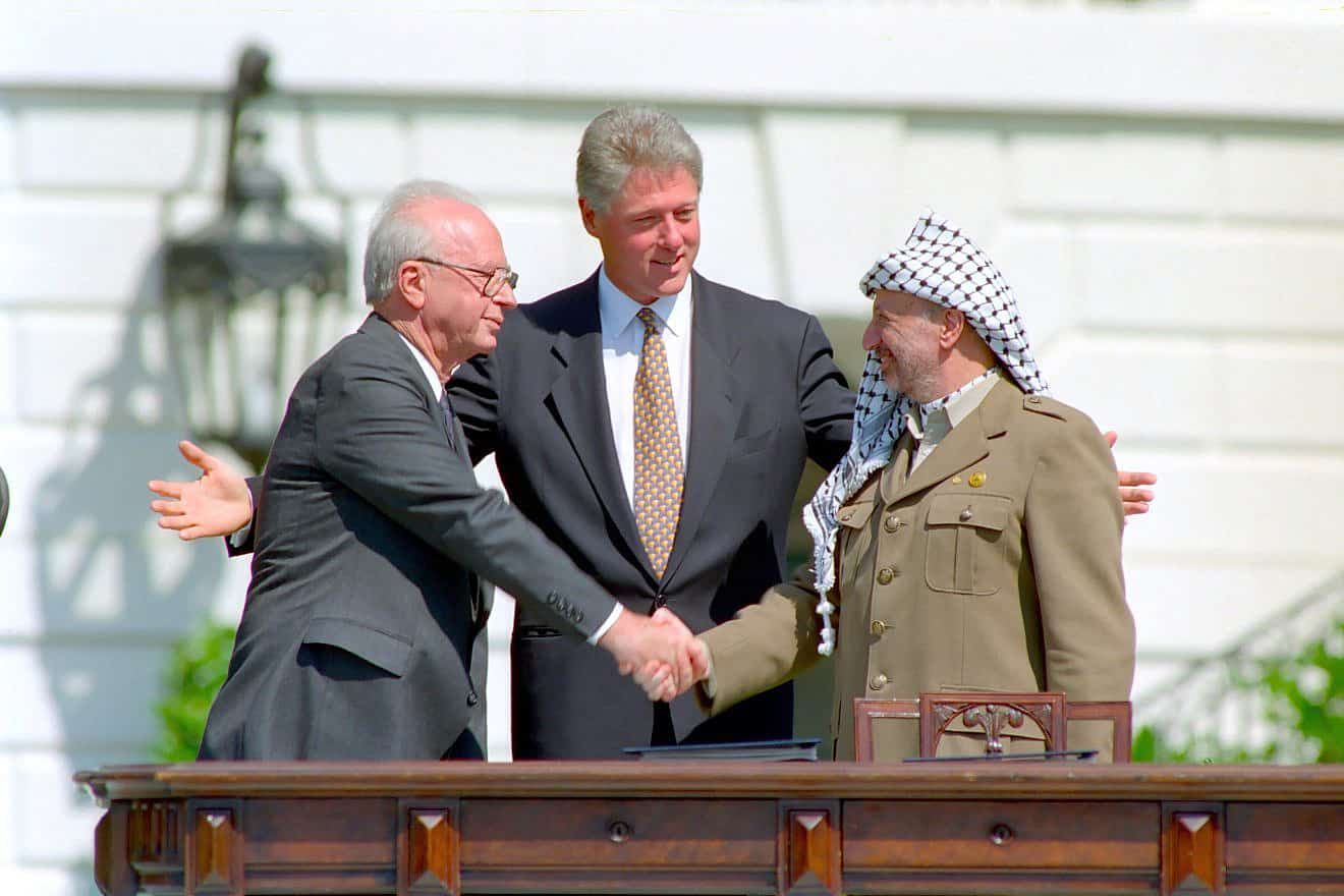 Прем'єр-міністр Ізраїлю Іцхак Рабін та голова ОВП Ясір Арафат потискають один одному руки на очах президента США Клінтона, 13 вересня 1993 року / Фото Білого дому