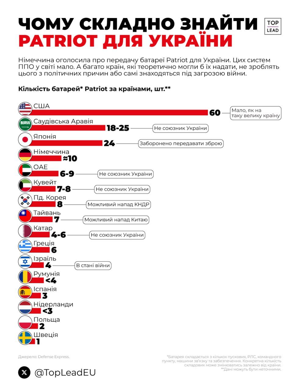 Держсекретар Марко Рубіо закликав союзників по НАТО подарувати Україні більше батарей Patriot, але в такій невизначеній міжнародній ситуації ті радше боронитимуть власні кордони. Володимир Зеленський ще у квітні висловив прагнення придбати щонайменше 10 таких систем у США, але Вашингтон поки мовчить.