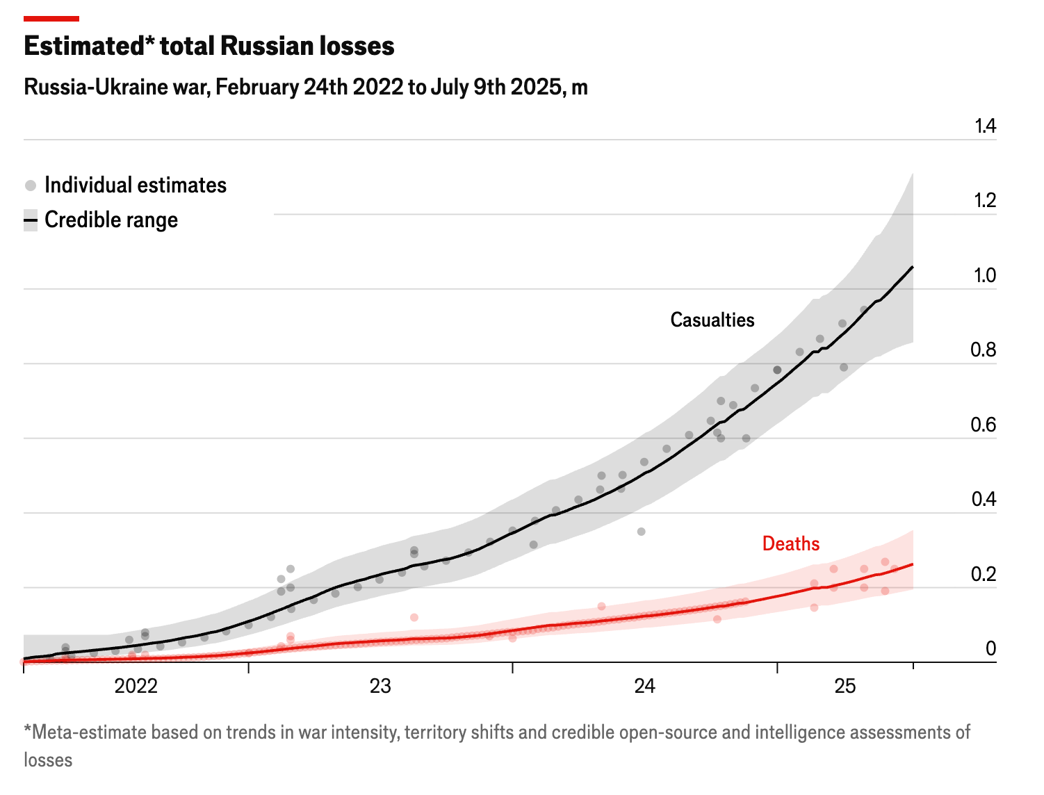 Путін має намір зламати моральний дух українців і здобути перемогу після більш ніж трьох років війни. Він також, видається, готовий за це заплатити. Так, щоденна кількість смертей у Росії вища, ніж на будь-якій іншій точці конфлікту,