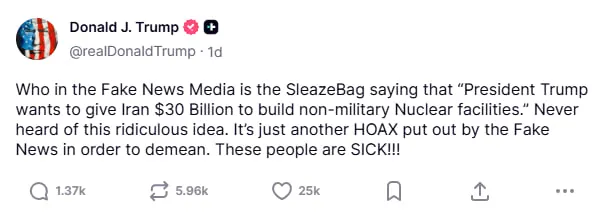 "Ніколи не чув про таку абсурдну ідею. Це просто черговий обман, поширений ЗМІ, які публікують фейкові новини, з метою приниження. Ці люди хворі", – написав президент США в одному зі своїх дописів у Truth Social.