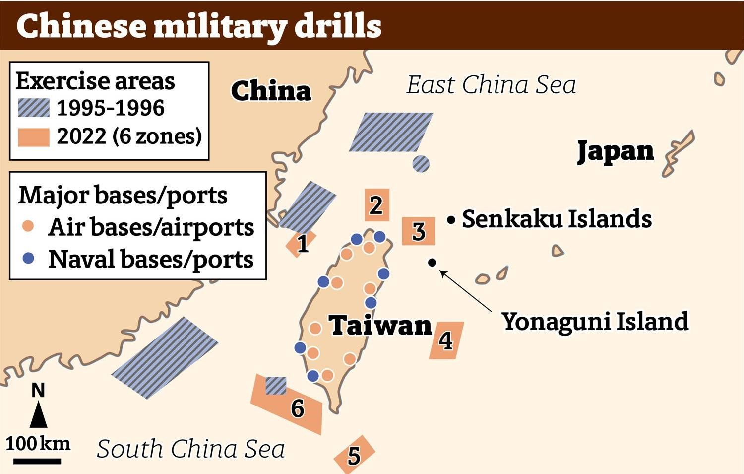 Схема військових навчань Китаю навколо території острова Тайвань / The Japan Times