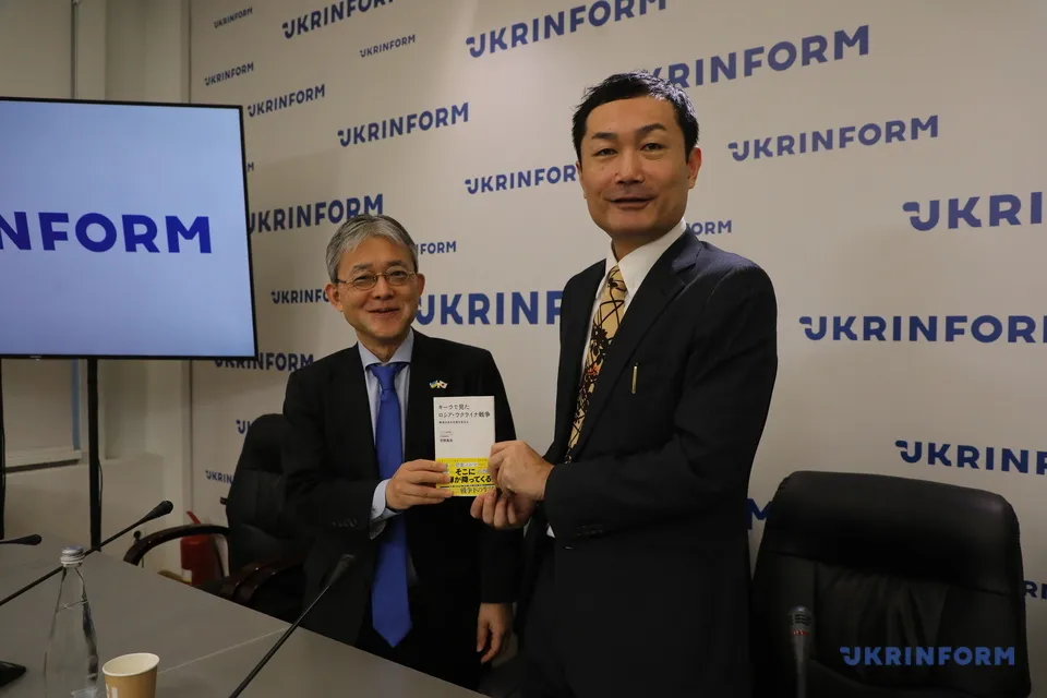 Такаші Хірано разом із послом Японії в Україні Масаші Накаґоме під час презентації книги "Російсько-українська війна очима з Києва. Жити життя з війною" / Фото Укрінформ