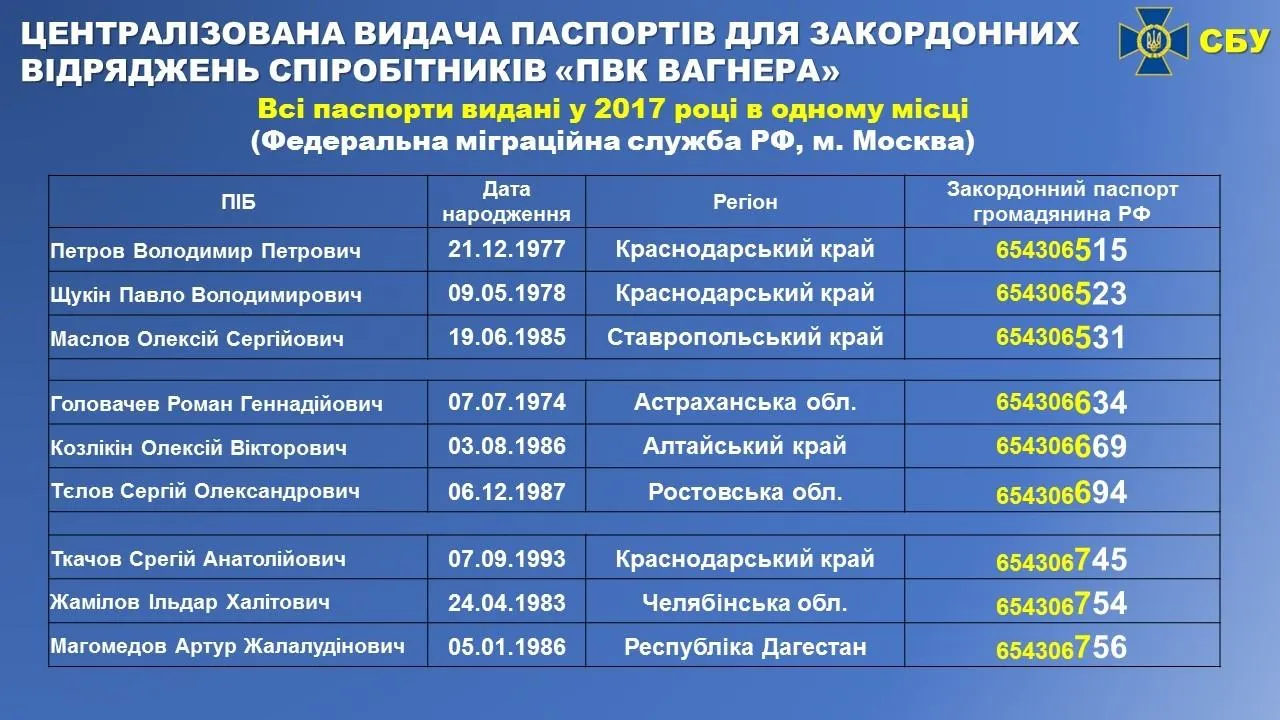 Дані, оприлюднені СБУ, про видачу документів наманцям із ПВК "Вагнера"