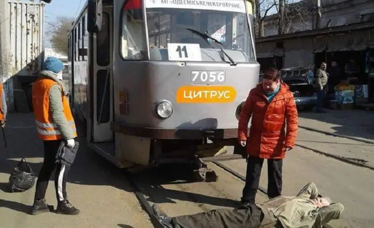 Натомість в Одесі у трамвай не пустили чоловіка без маски. На знак протесту він влаштував лежачий пікет на рейках.