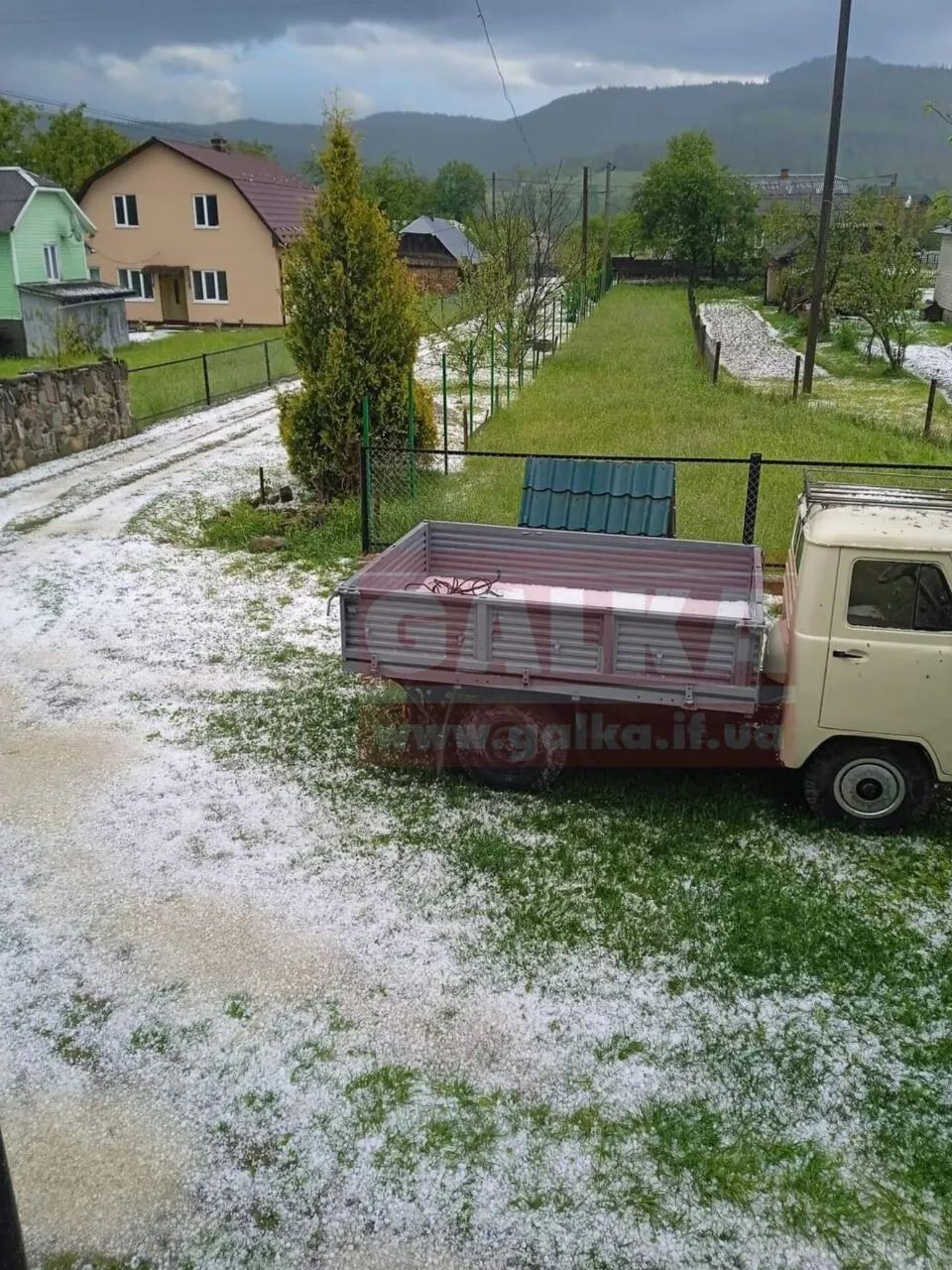 Льодяні кульки сипалися з неба в кількох регіонах Івано-Франківщини, а в інших ішов дощ з грозою. На Богородчанщині "побіліли" дороги та трава.
