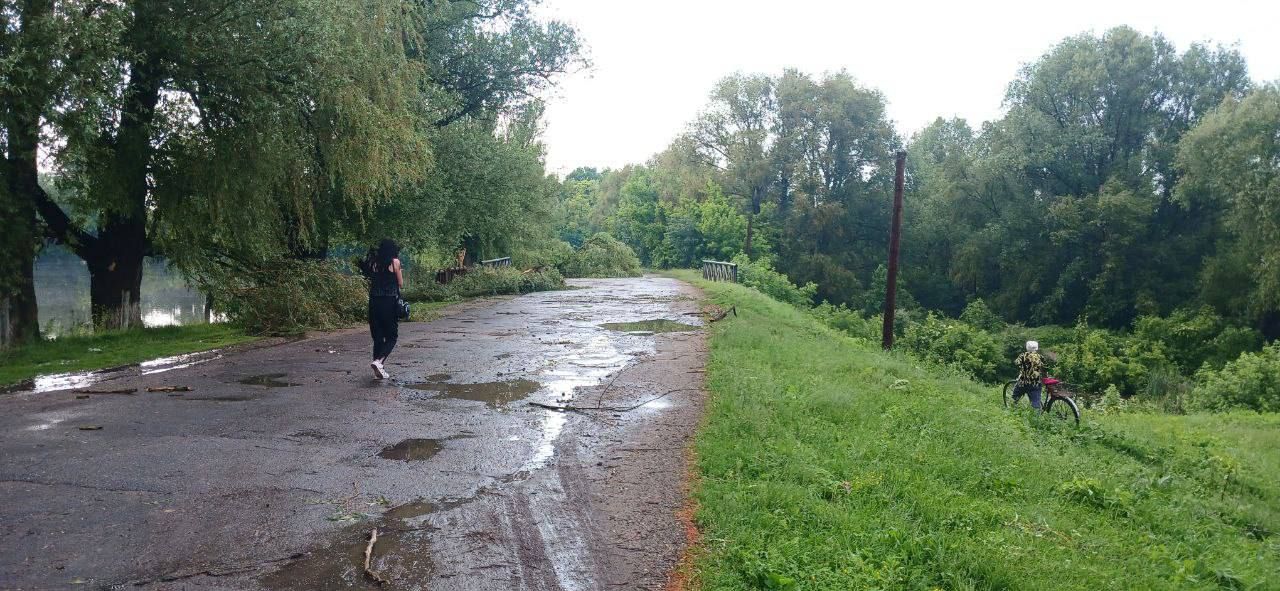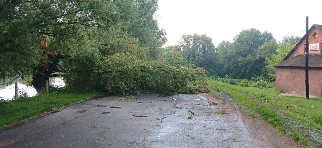 У мережі поділилися кадрами негоди. У Старокостянтинові, зокрема, сильний вітер повалив дерева.
