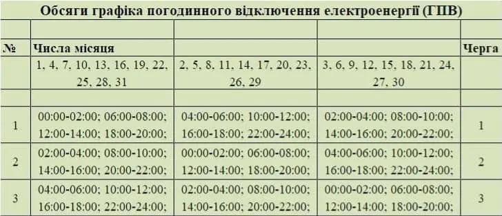 - з 00:00 до 04:00, з 08:00 до 12:00 та з 16:00 до 20:00 (підчерги 3.1 та 3.2 будуть вимкнені);
