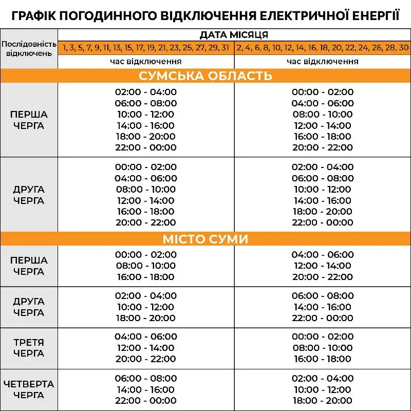 У Черкаській області діятимуть графіки погодинних відключень. Ось графік вимкнень по чергах ГПВ на листопад 2022 року: