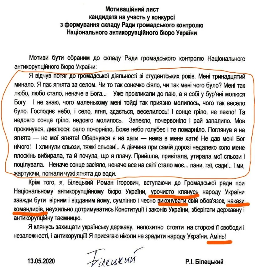 Потім кандидат пише, що клянеться виконувати накази командирів. Цікаво, чи пан Білецький розуміє куди саме він йде? Закінчує він свій "твір" традиційним для молитви словом "Амінь".
