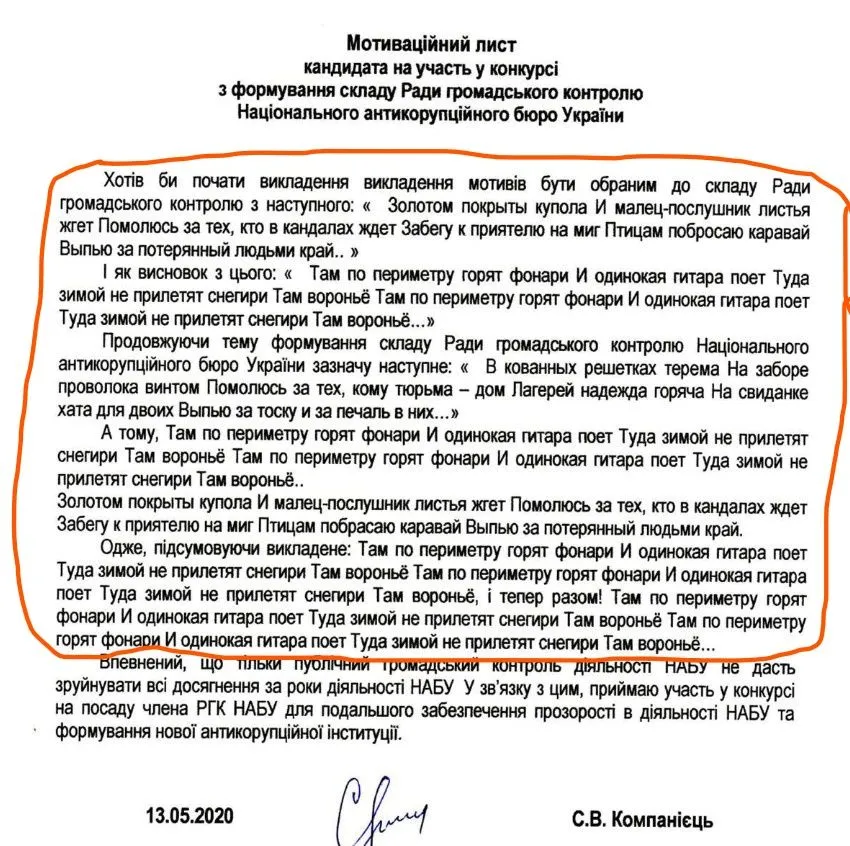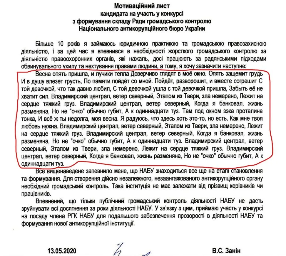 А представник ГО "Контроль влади" Владислав Занін та представник ГО "Громадський контроль діє" Станіслав Компанієць у своїх мотиваційних листах вирішили процитувати шансон: "Владимирский централ, ветер северный, этапом из Твери, зла немерено".