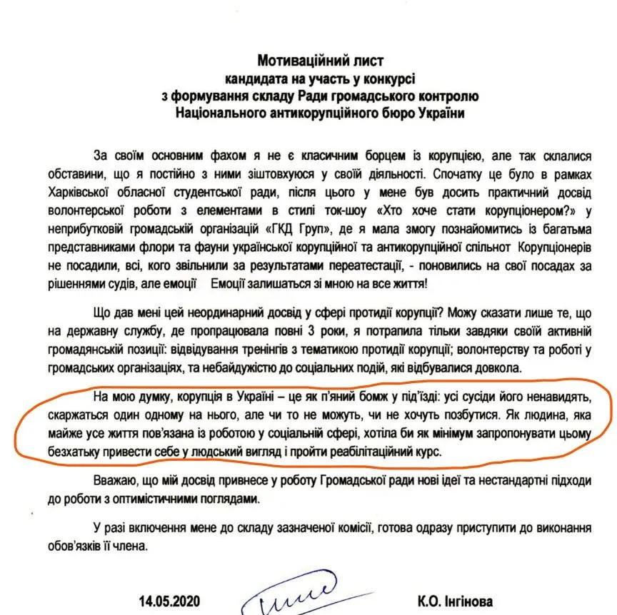 І на завершення до уваги наших читачів найцікавіший "твір". Його автором є Роман Линник, який був висунутий аж від трьох громадських організацій – ГО "ГКД ГРУП", ГС "Антикорупційна спілка "Громадський контроль", ГС "Правозахисна спілка "ГКД Груп".