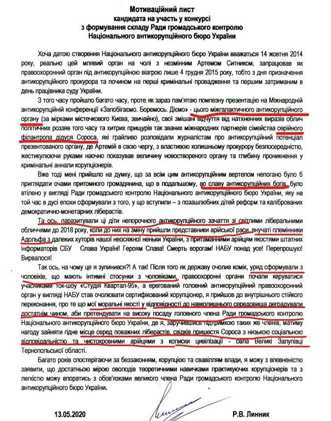 У своєму мотиваційному листі Линник називає НАБУ – "міжгалактичним антикорупційним органом". Кабмін Зеленського іменує урядом, який "сформований з чоловіків, що мають інтимні стосунки з чоловіками". Іронічно прозиває Джорджа Сороса серійним філантропом, а НАБУ, за переконанням Линника, керують "представники арійської раси й внучаті племінники Адольфа".
