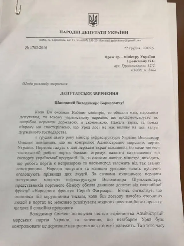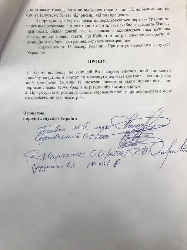 У зверненні до Володимира Гройсмана депутати просять дати відповідь, які кроки має намір зробити прем'єр, щоб "повернути державі контроль над галуззю, щоб громадяни України і іноземні інвестори були впевнені, що портами насправді керує уряд, а не різноманітні "смотрящі"". Також наголошується, що представників портового бізнесу обклав даниною депутат від коаліційної фракції "Народного фронту" Сергій Фаєрмарк.