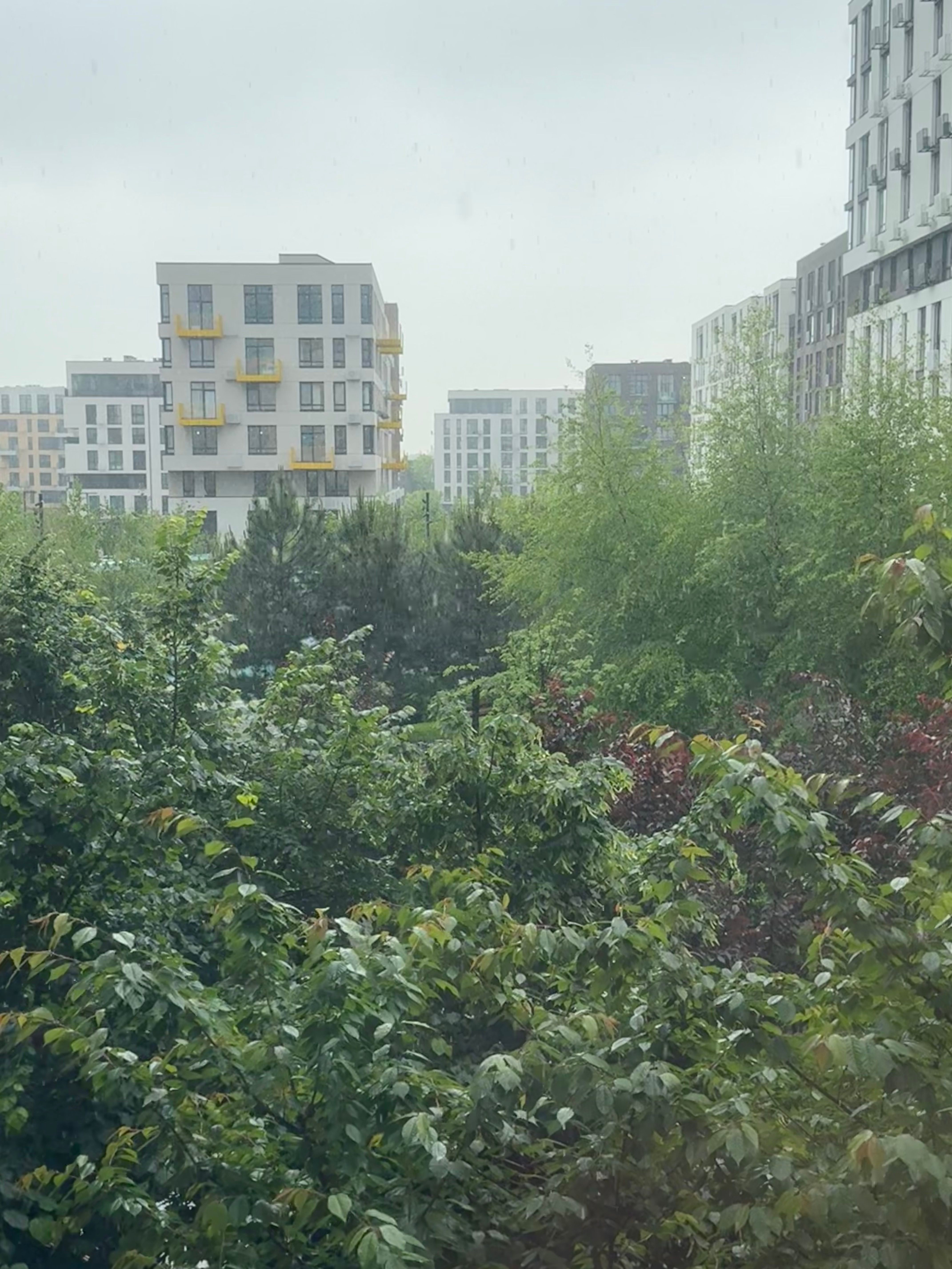У столиці у четвер у першій половині дня почалася гроза. У місті йшла злива, а також сильно гримів грім.