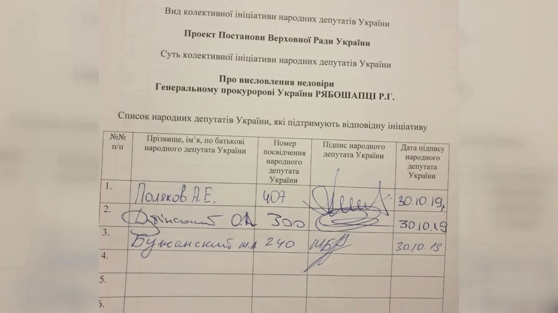 Ілля Кива і вся фракція опозиціонерів раніше заявили, що виловлюють недовіру чинному генеральному прокурору Руслану Рябошапці. Ба більше, вони прагнуть його відставки. До них долучився і колишній радник Януковича Андрій Портнов.
