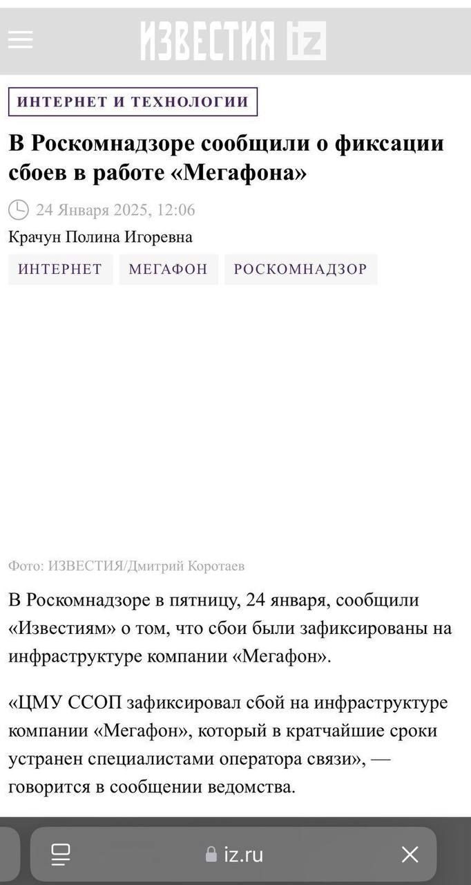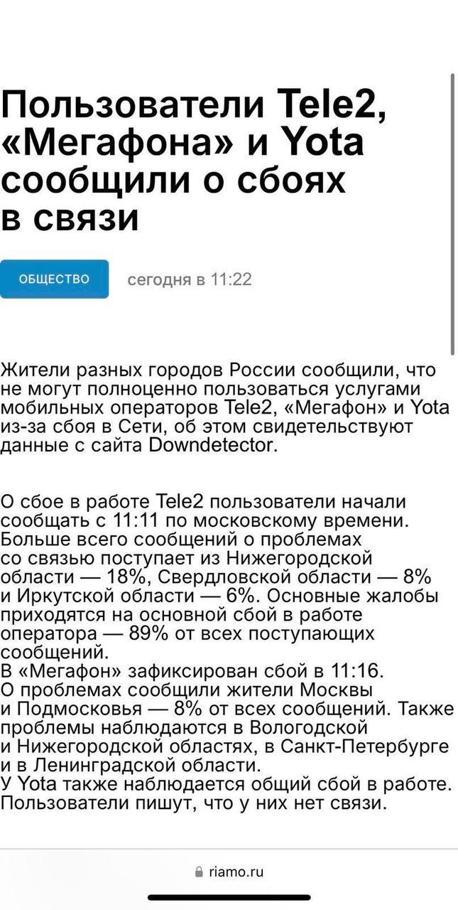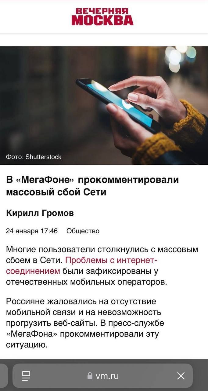 Від вчорашнього ранку мешканці Москви, Санкт-Петербургу та багатьох центральних регіонів Росії почали скаржитися на перебої з мобільним зв’язком, інтернетом, а також на погану роботу багатьох мобільних сервісів та додатків. Вже за кілька годин в "Роскомнагляді" підтвердили "сбой на инфраструктуре компании МегаФон".