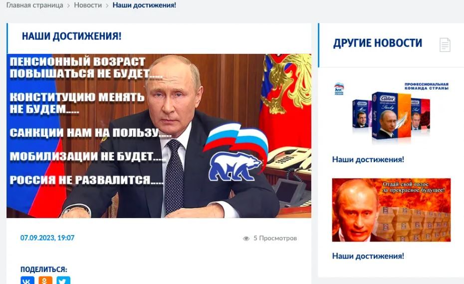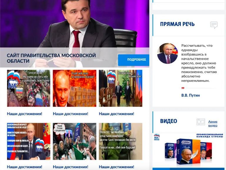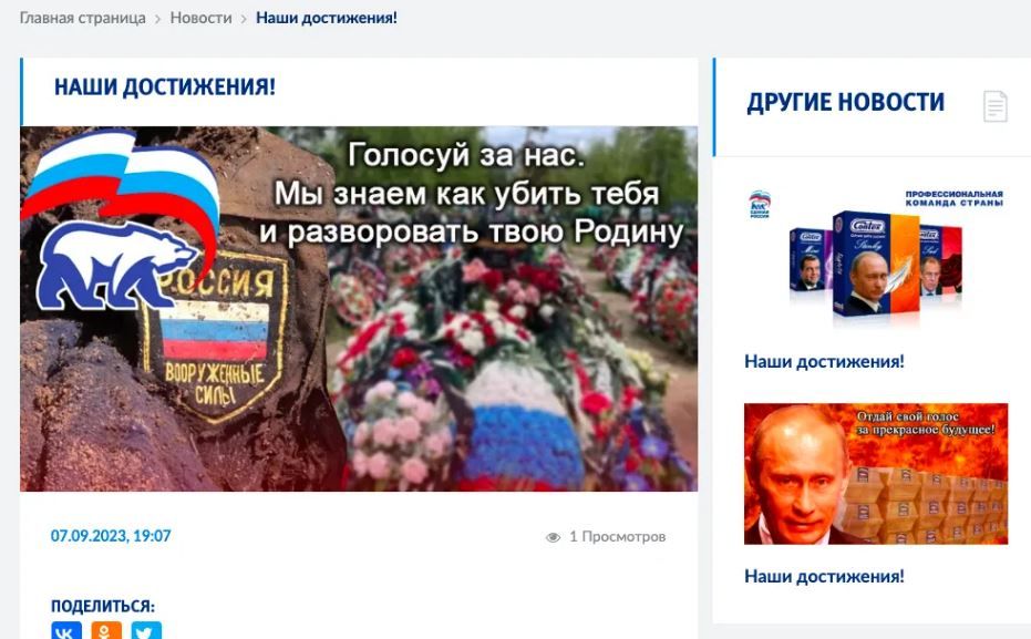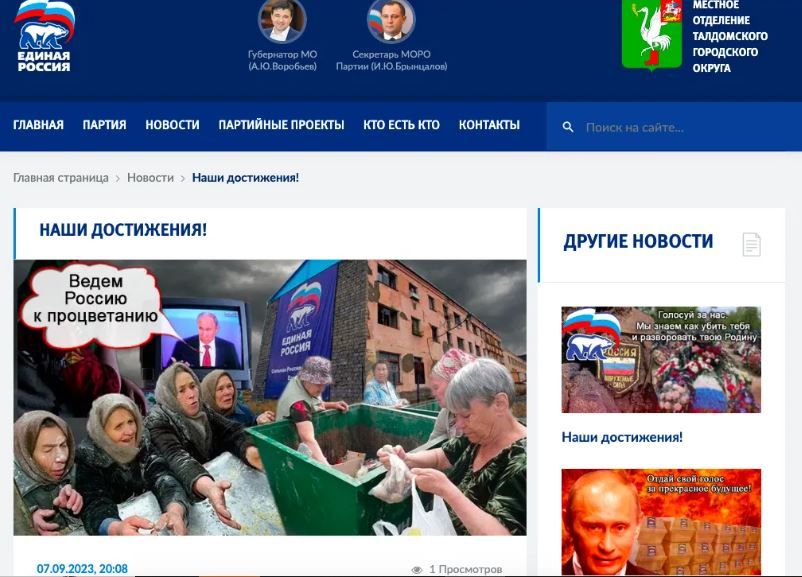 Хакери зламали 59 сайтів урядової російської партії "Єдина Росія" у Московській області та виклали правду про війну в Росії. Більшість дописів присвячена бідності людей під правлінням диктатора та тому, що Путін веде росіян на забій.