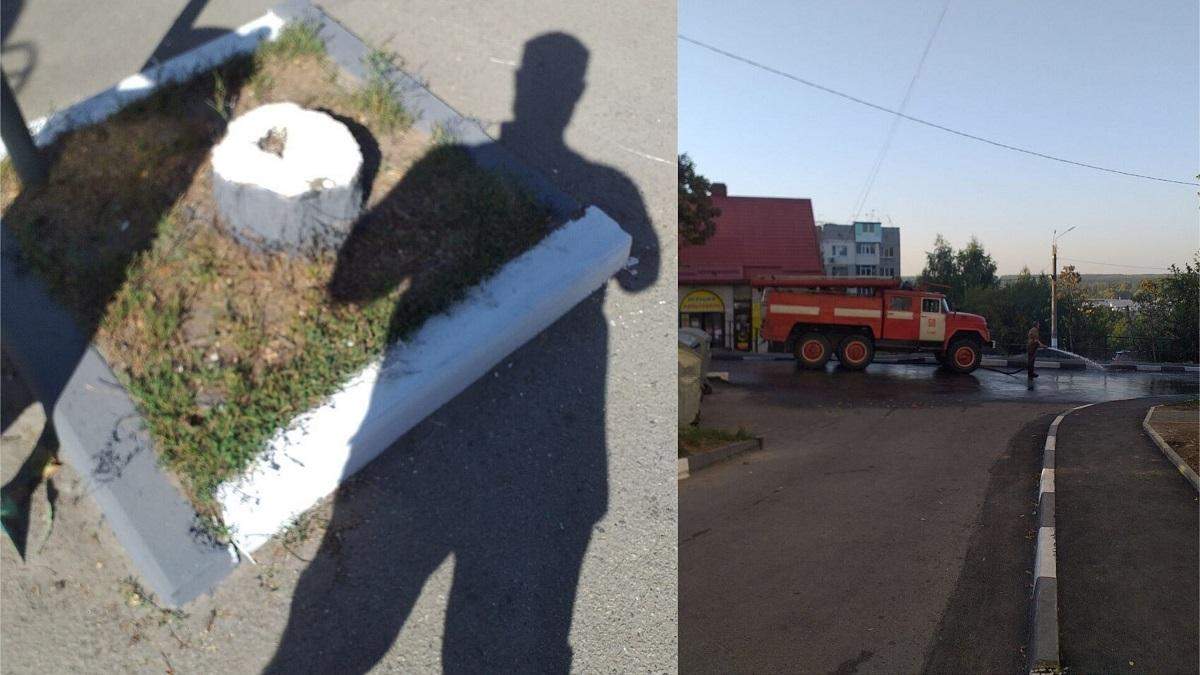 Та не дорогою єдиною. Коли автошляхи стали "ідеально рівними", у Пісочині вирішили довести до ладу й пеньки. Для цього їх пофарбували, а асфальт – той, який не довелося лагодити – помили за допомогою пожежних машин.