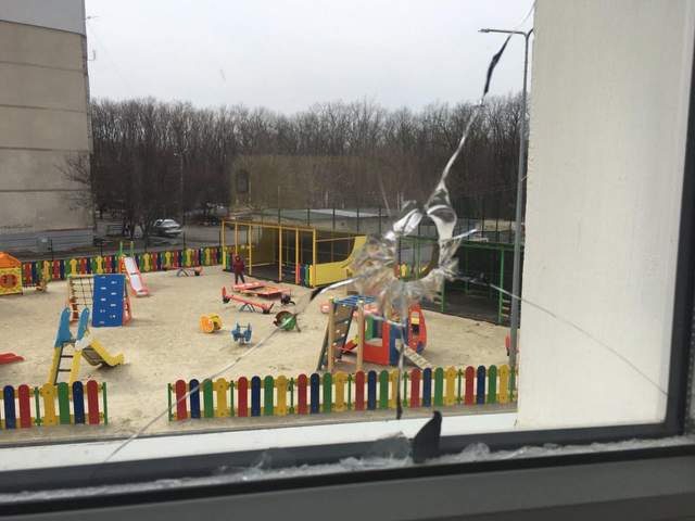 Також сліди пошкоджень є на фасаді будівлі, на тіньових навісах та вуличних ігрових комплексах.