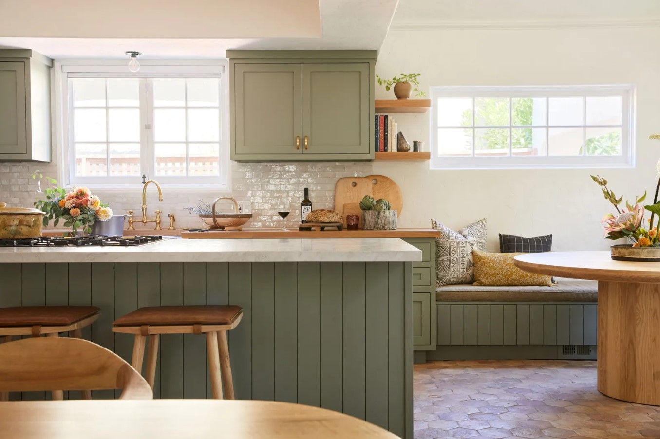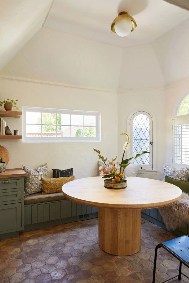 Поруч розташована кухня з обідньою зоною. Як розповіла Добрев, раніше між їдальнею та кухнею була стіна, однак зірка хотіла мати відкритий концептуальний простір, тому її знесли. Кухня, напевно, одна із кімнат, яка зазнала найбільших змін. Так, Ніна Добрев замінила старі стільниці на доломітову плиту, а шафи пофарбували у трендовий оливково-зелений колір. Щоб додати нових акцентів, усю стару фурнітуру замінили на нову з латуні. Особливого шарму кухні додає вінтажна плита з духовкою. Що стосується обідньої зони, то тут стоїть круглий стіл з натурального дерева, а поруч – м'який куточок, який оформлений у тон до кухонних шаф.