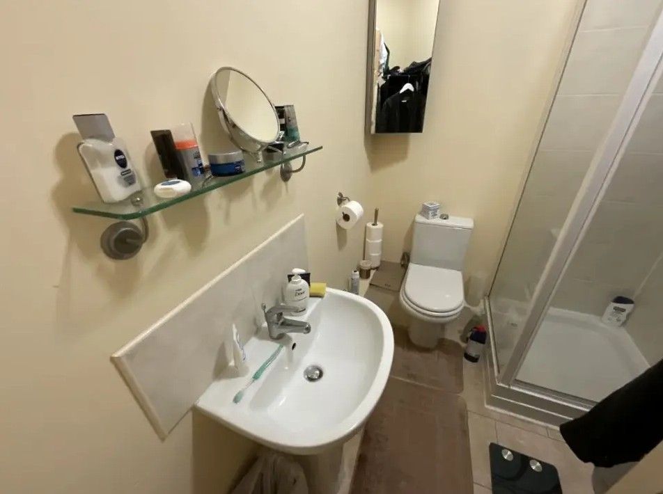 Ванна кімната також дивує своїми крихітними розмірами. Всередині є невелика душова кабіна, раковина та туалет.