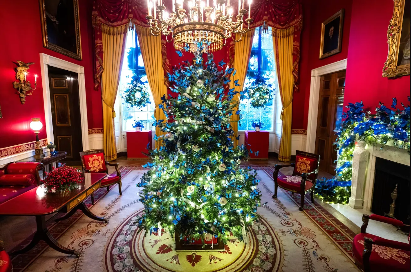 Красная комната и ее елка оформлена более 10 000 бабочками, символизирующими развитие молодежи – будущего нации. Бабочки являются данью инициативе Мелании Трамп Fostering the Future, части программы "Be Best", поддерживающей детей из приемных семей.