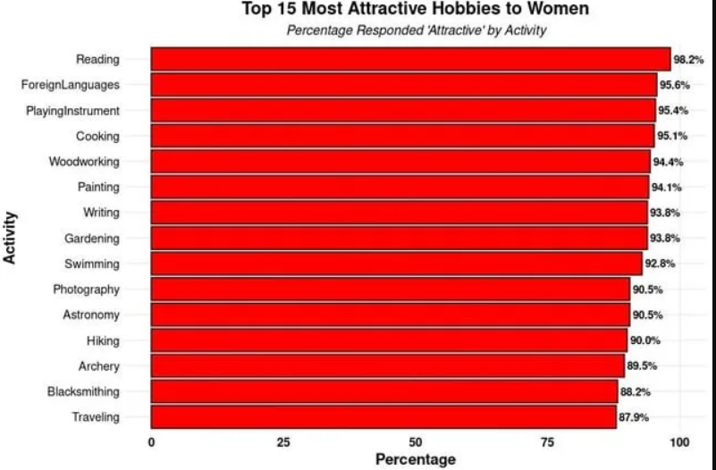 Интересно, что хобби, такие как кузнечное дело или стрельба из лука, тоже неожиданно получили высокие баллы. Один пользователь Reddit даже рассказал, что стрельба из лука помогла ему найти свою пару – увидев его фото с луком, девушка написала первой, и их первые свидания проходили на стрельбище.