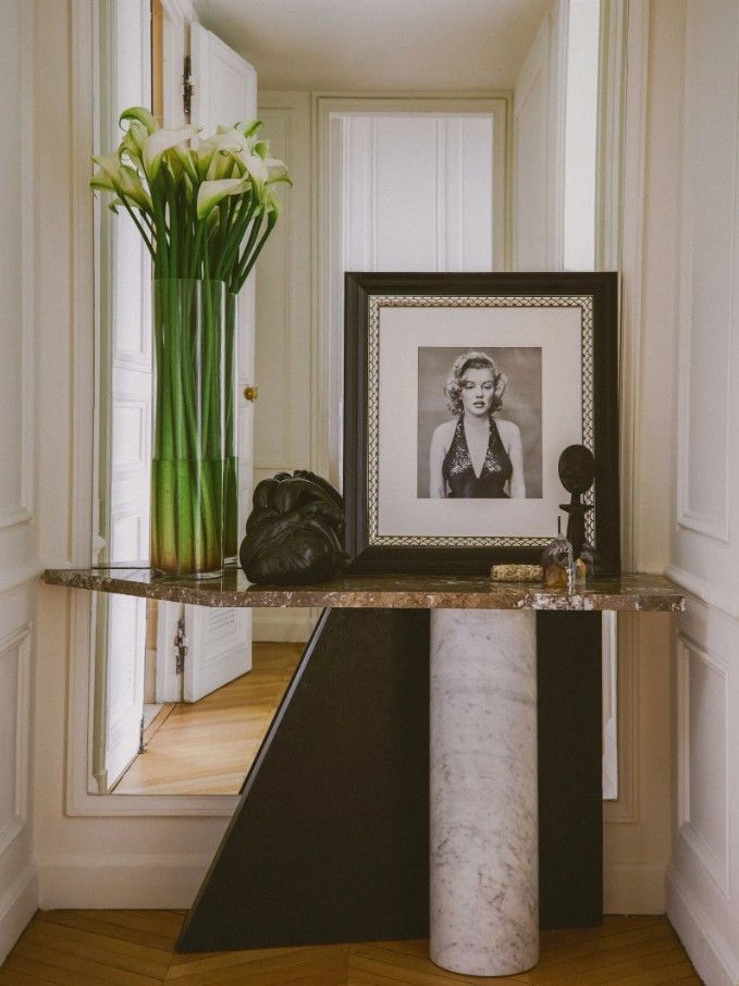 Так, в прихожей сразу стоит рояль, в проектировании которого участвовал сам. Поскольку особняк отдает дань памяти матери рок-звезды, то в доме есть небольшой салон с ее фотографиями. В прихожей также стоит винтажный журнальный столик 1970-х годов, пара бронзовых резных деревянных бивней племени Бамилеке середины XX века и винтажные ковры. Также в прихожей можно увидеть подвесную тумбу в стиле брутализма от Пола Эванса, примерно 1970 года, голландское зеркало XVII века, резную маску Songye, изысканный светильник-бра и фотографии известного фотографа Леонарда Фрида.