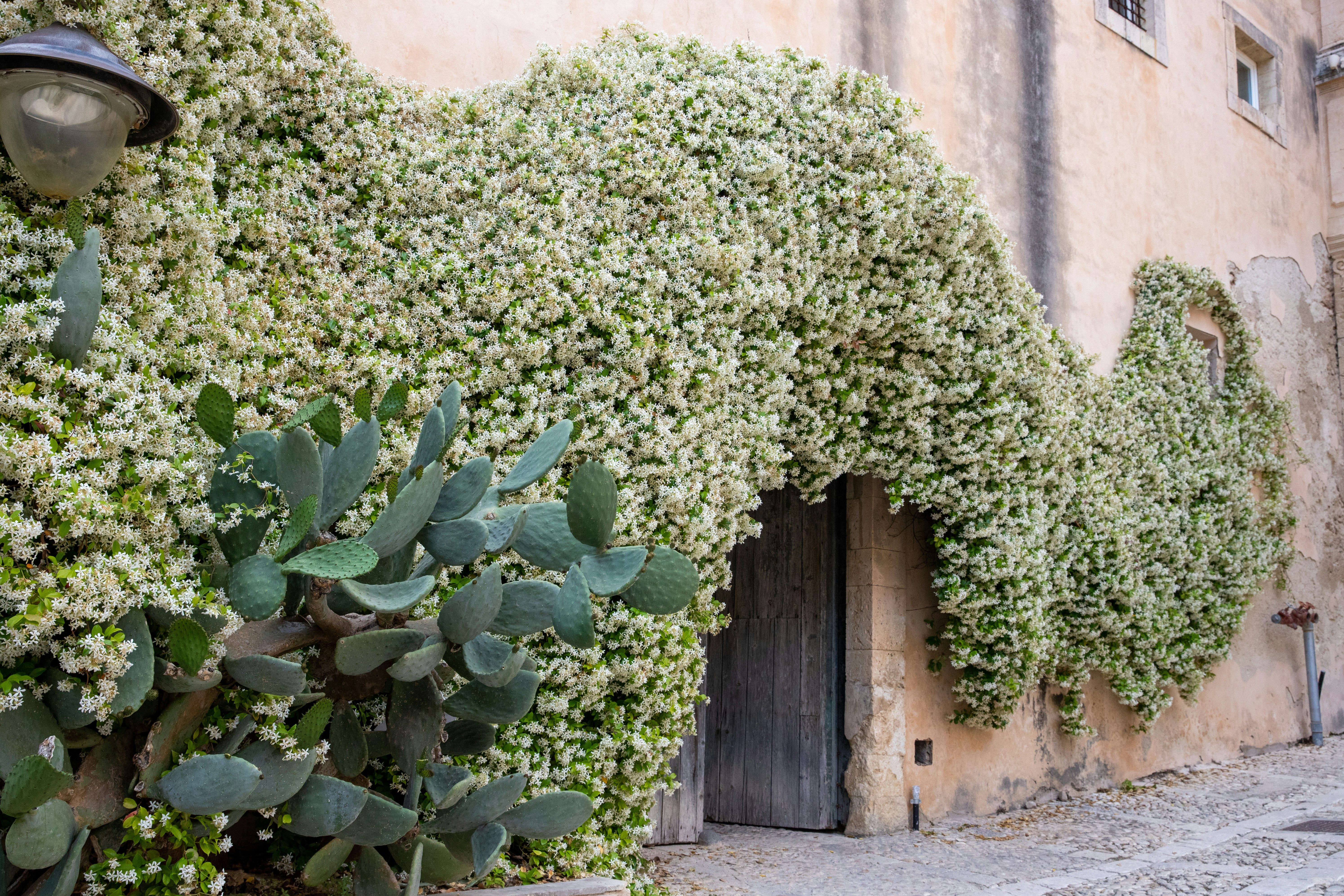 Звездчатый жасмин – еще один замечательный выбор вьющихся цветов для сада. Это растение имеет пышные зеленые листья и цветы в форме звезды, что делает его идеальным для веранд, патио и любого места, где можно насладиться закатом с коктейлем. Жасмин также имеет душистый аромат, который окутывает весь сад.