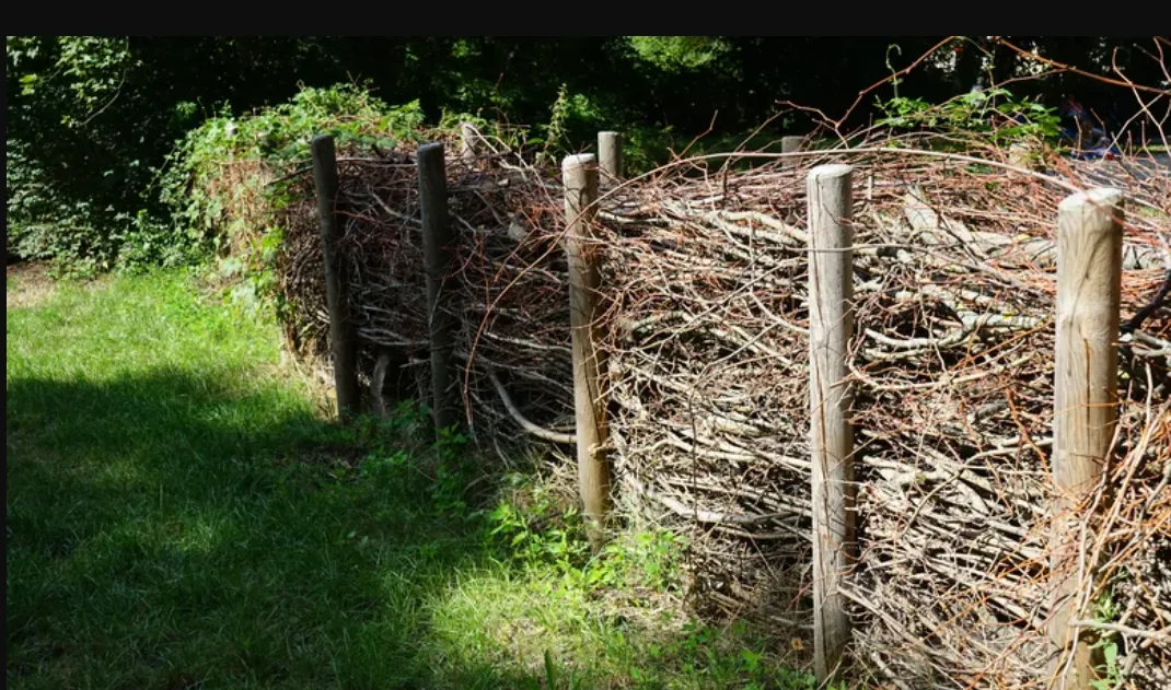 - Между ними начните плотно укладывать и переплетать ветки, обрезки и сучки. Добавляйте слои, пока не получите нужную высоту. Повторяйте процесс вдоль всего запланированного забора.