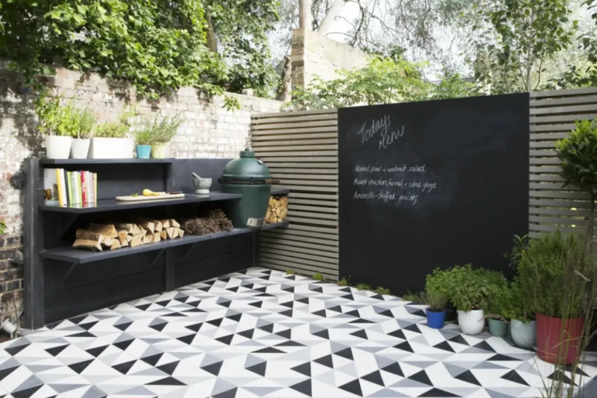 Сделайте акцентную стену. Например, покрасьте часть забора как школьную доску или установите решетку для лиан. Это придаст оригинальности.