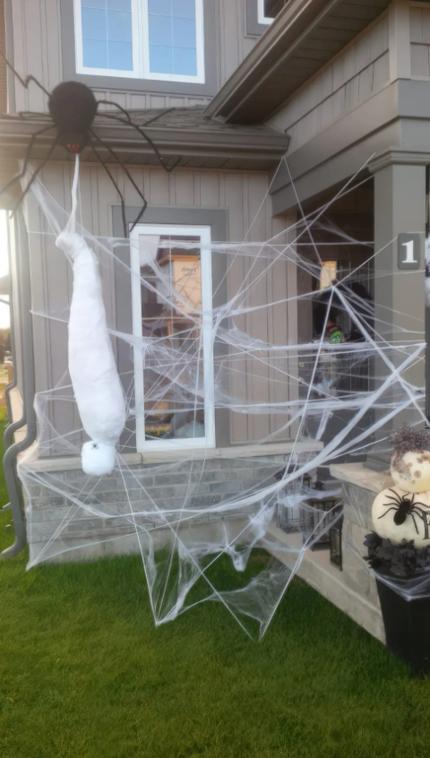 Жуткий декор на улице на Хэллоуин с паутиной, пауками, мумией и тыквами вокруг / Фото Shelterness