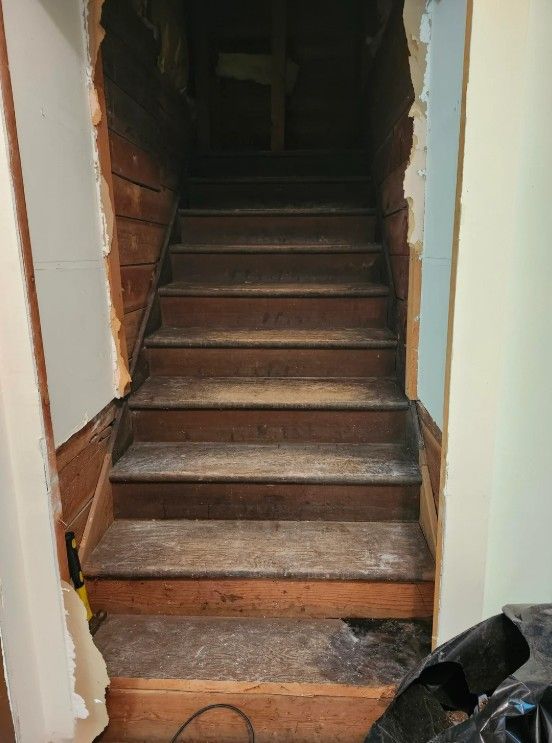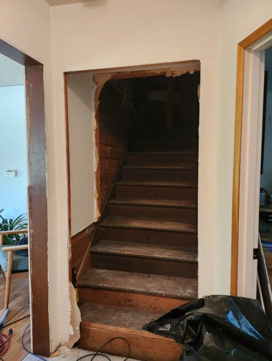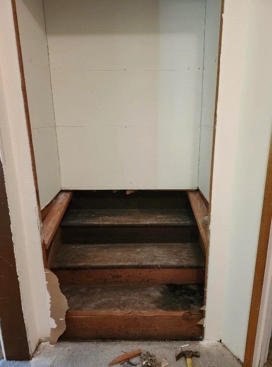 Піднявшись цими сходами та заглянувши у другий горищний простір, ми побачили, де були знижені стелі, світильники у старих приміщеннях і навіть шпалери зі старої кімнати. Ми думали про те, щоб продовжити будівництво сходів і завершити друге горищне приміщення над ними. Тож чим це стане, поки що невідомо,