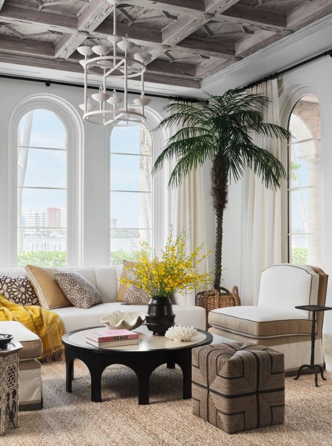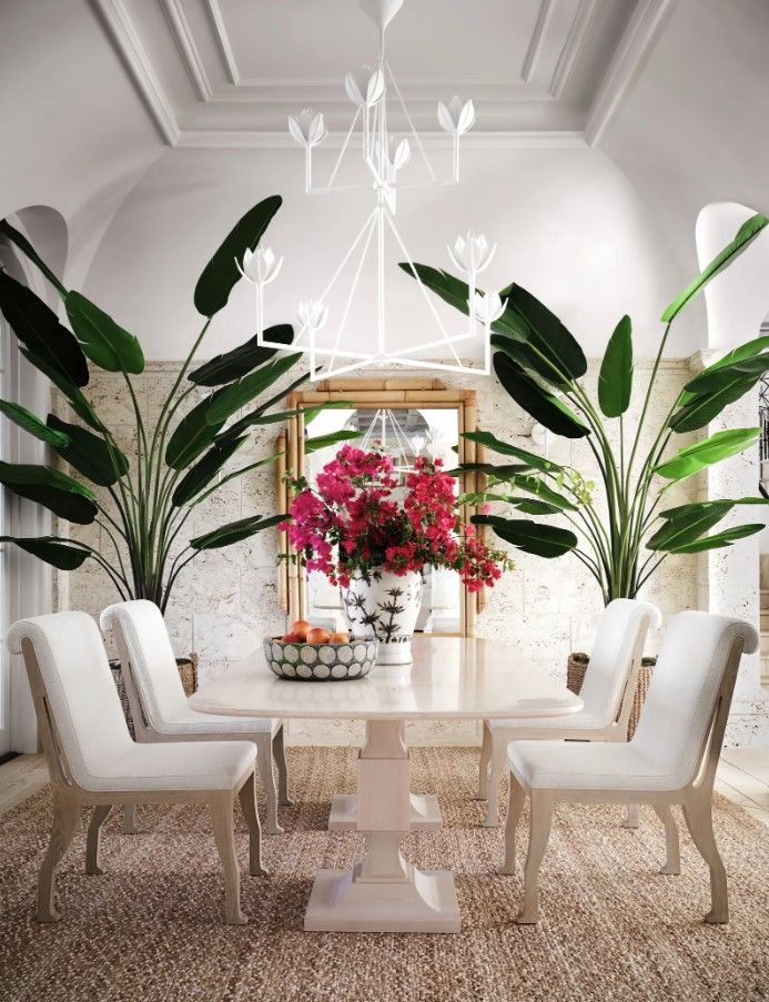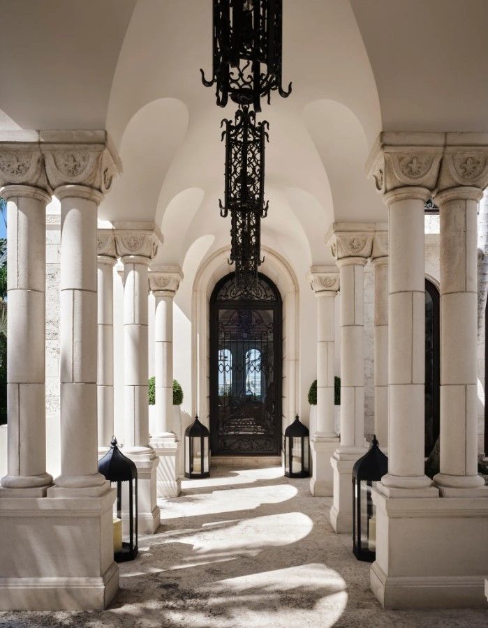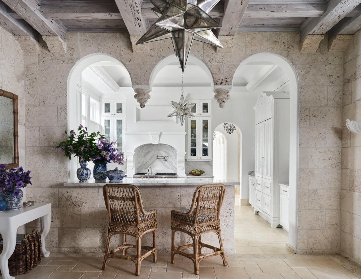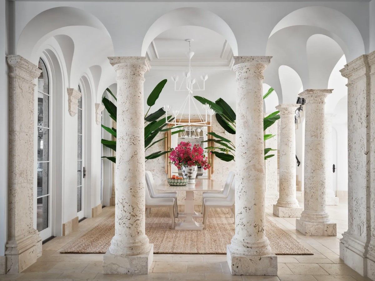 Весь будинок дизайнера виконаний у світлих відтінках. Колони та високі аркові стелі додають особняку розкоші та наповнюють його середземноморським стилем. Цю естетику підкреслює ніжний декор морської тематики.