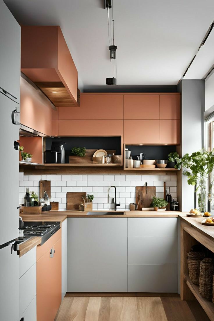 Серед найбільш популярних кольорів називають ніжний персиковий та теракотовий. Вони гармонійно поєднують теплоту та м'якість, створюючи затишну атмосферу, не перевантажуючи кухню.