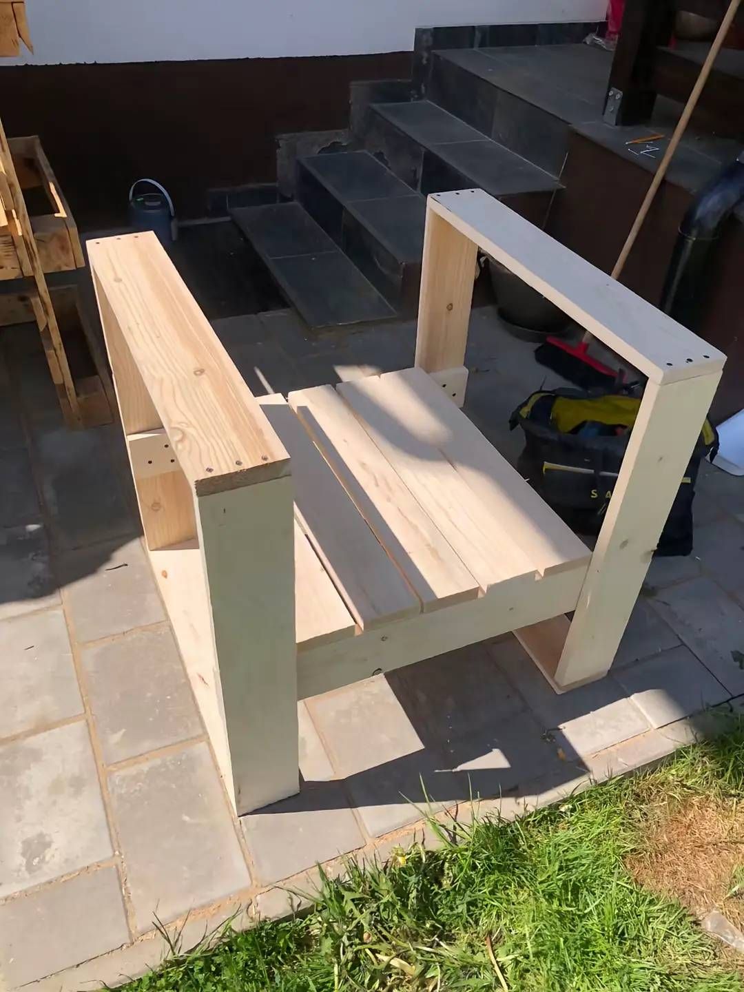 Потім слід прикрутити ще 2 дощечки, приблизно на середині ніжок, які стануть основою для сидіння. Коли каркас буде готовий, то можна прикручувати інші дощечки на сидіння.