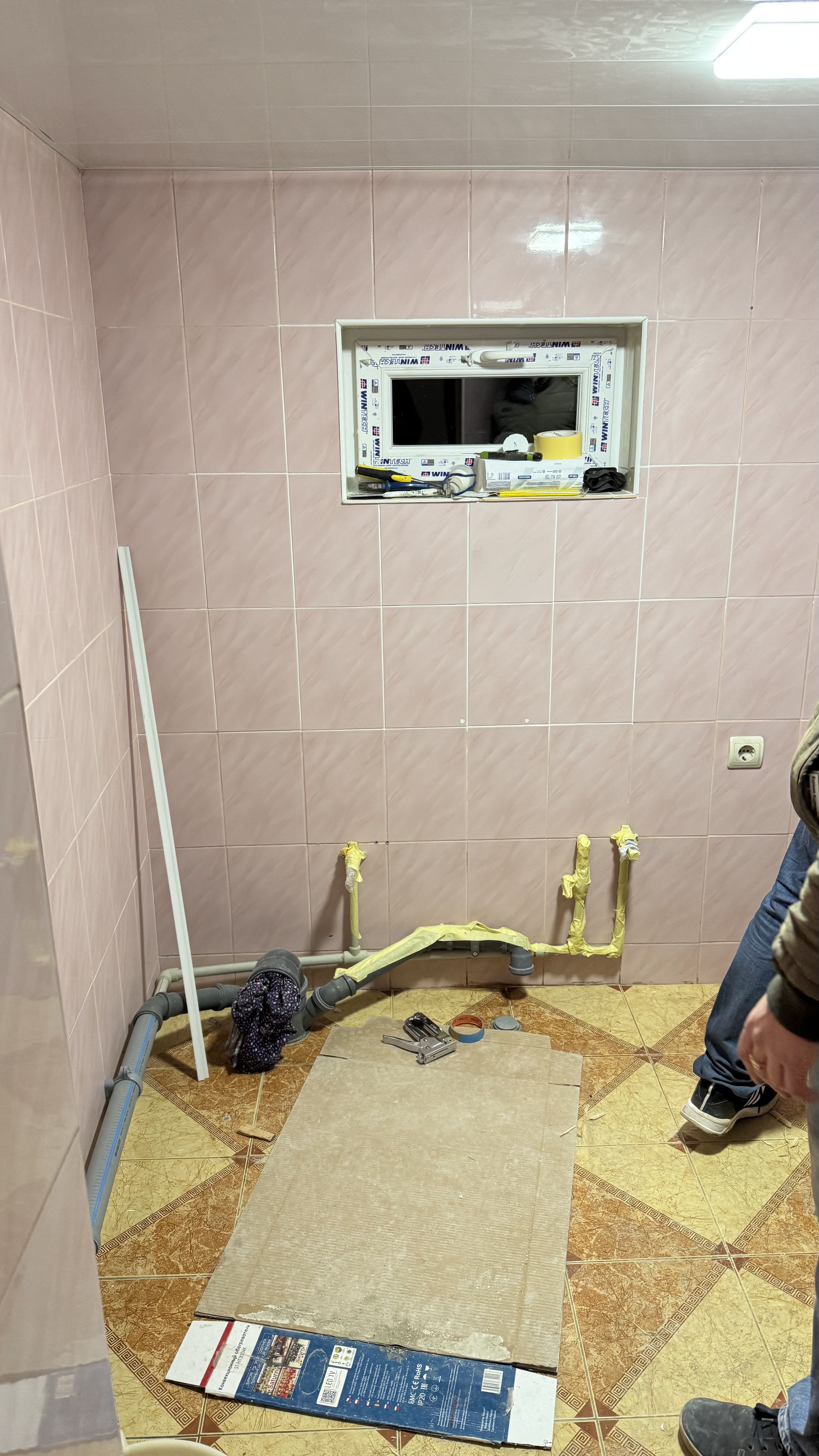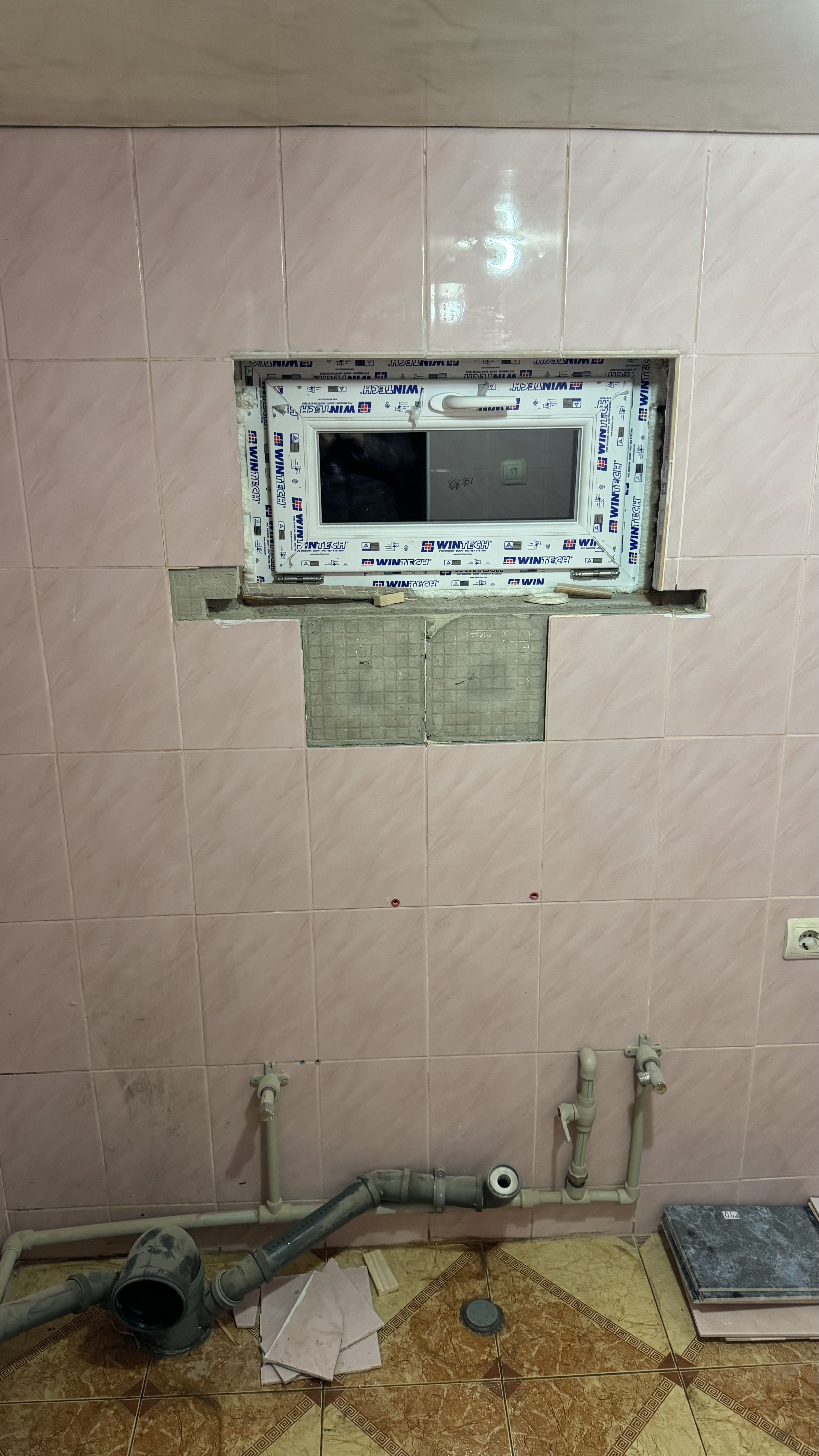На стінах була рожева глянцева плитка, на підлозі – коричнева та бежева з грецькими мотивами. Ми вирішили замінити маленьке віконце на нове, і під час цього кілька плиток тріснули та відпали. Тоді з'явилася проблема, чим закрити ці місця.