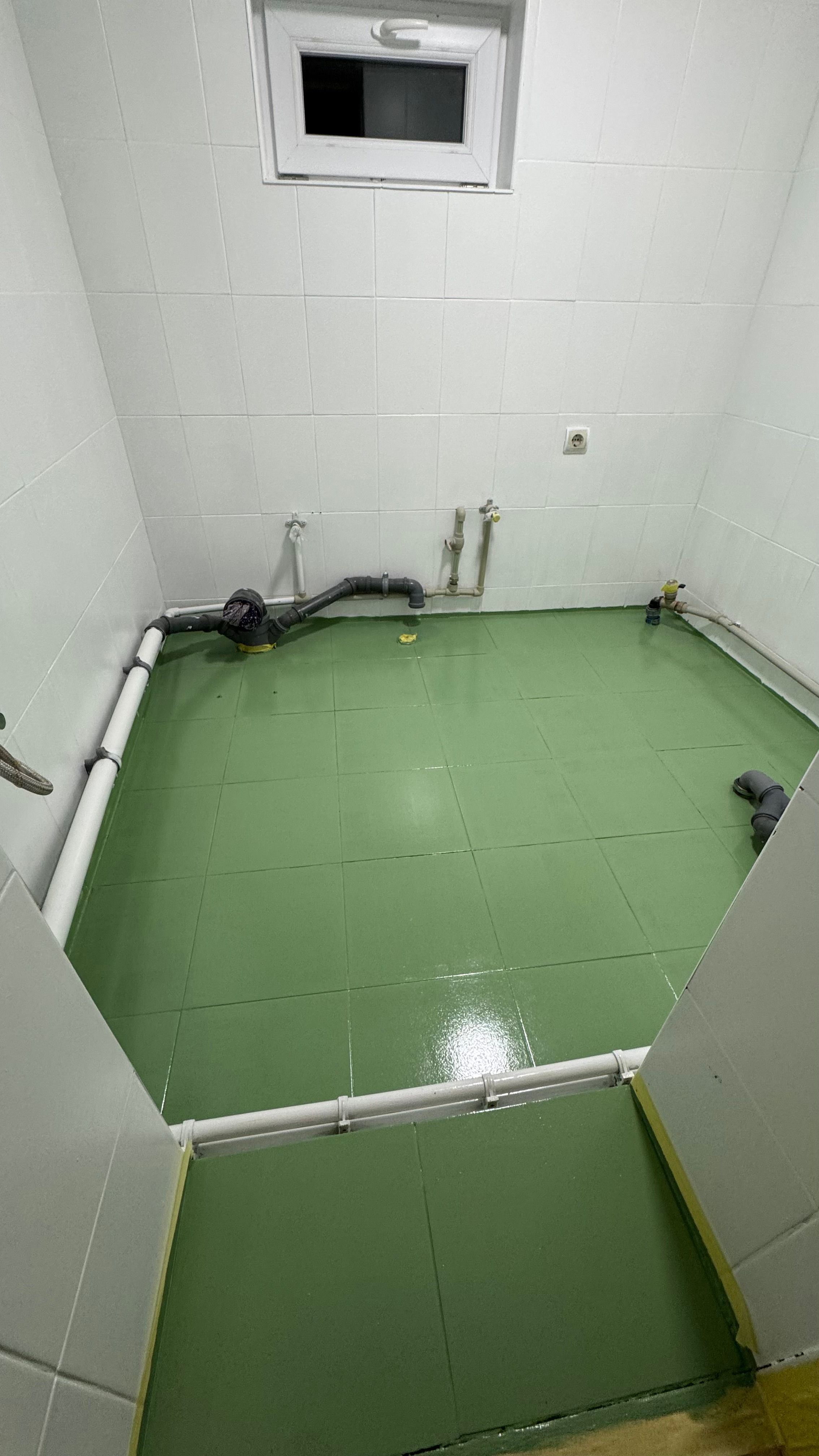 Я собі запланувала, що стіни та підлога будуть білого кольору. Але потім я зрозуміла, що мені буде дуже важко перекрити темну плитку на підлозі. Вирішили зробити підлогу якогось зеленого відтінку, бо в нас загалом буде біло-зелена стилістика та багато зелених елементів. Я довго шукала гарну епоксидну фарбу, але окрім розпіареного варіанту не було жодного, і я таки її замовила.