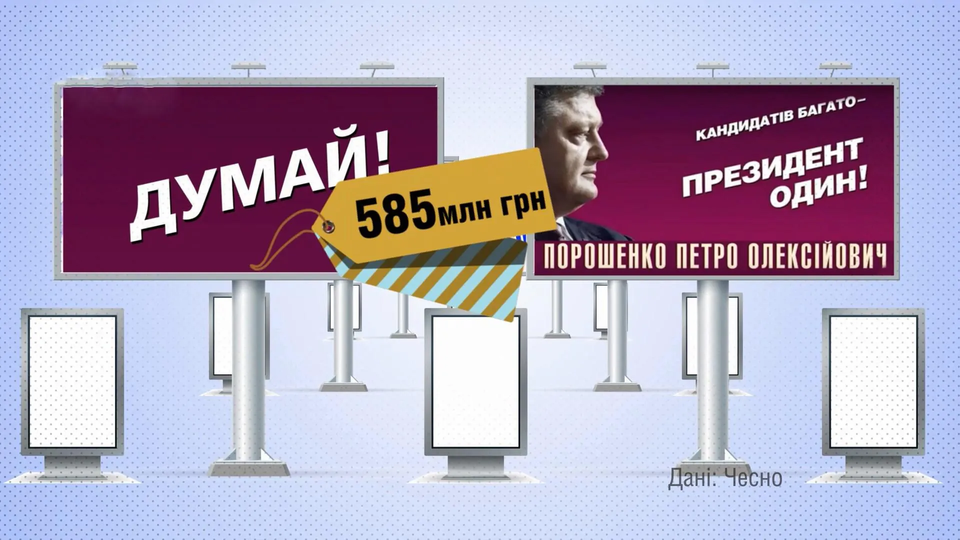 І третина всіх витрат належить Петру Порошенку. П'ятий президент України витратиі на рекламу і відомі борди "Думай!" 585 мільйонів гривень.
