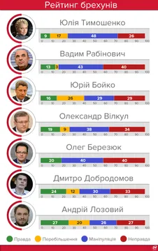 Замикає трійку брехунів співголова фракції "Опозиційний блок" у парламенті Олександр Вілкул. З 31 його фрази лише 5 були правдивими.