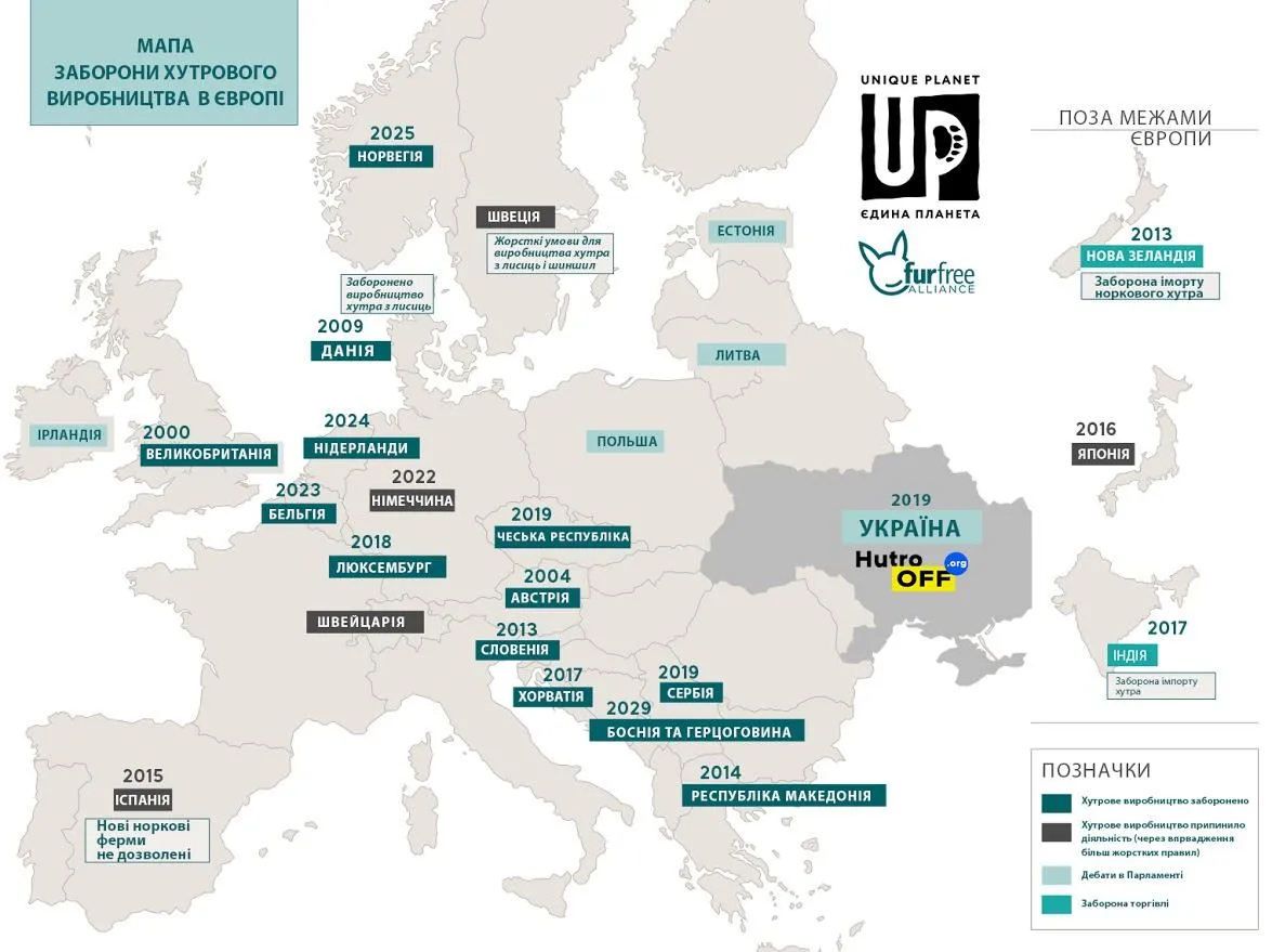 У багатьох країнах Європи вже прийняті закони, що ініціюють повну заборону продажі і виробництва хутра до 2025 року. Серед них – Норвегія, Бельгія та Нідерланди. Боснія і Герцоговина повністю заборонить такий кривавий бізнес до 2029 року. А Великобританія, Австрія, Данія, Люксембург, Хорватія та Сербія повністю відмовились від хутра в проміжку з 2000 до 2019 року. Такий шлях не є одноденним, але він повністю виправданий та можливий.