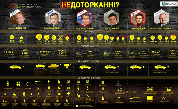 Значно скромніше виглядають статки другого фігуранта Максима Полякова – у нього лише 650 тис. гривень і 291 тис. доларів. Подання на зняття недоторканності з Розенблата та Полякова Верховна Рада підтримала, але дозволів на затримання і арешт не дала.