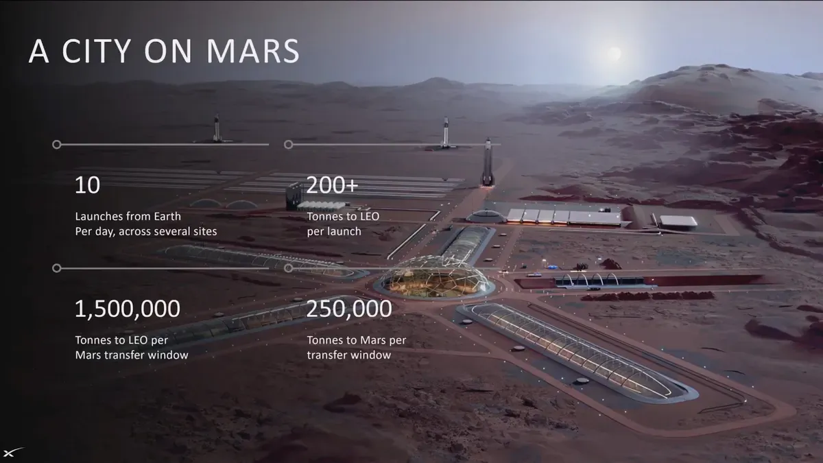Кінцева мета – самодостатнє місто, здатне вижити без зв’язку з Землею. У ньому має жити понад мільйон людей, а доставити туди доведеться мільйони тонн вантажів. Маск припускає, що в майбутньому до кожного вікна запусків між Землею і Марсом прилітатимуть і відлітатимуть тисячі верхніх ступенів Starship – можливо, вже нової версії, заввишки 142 метри.