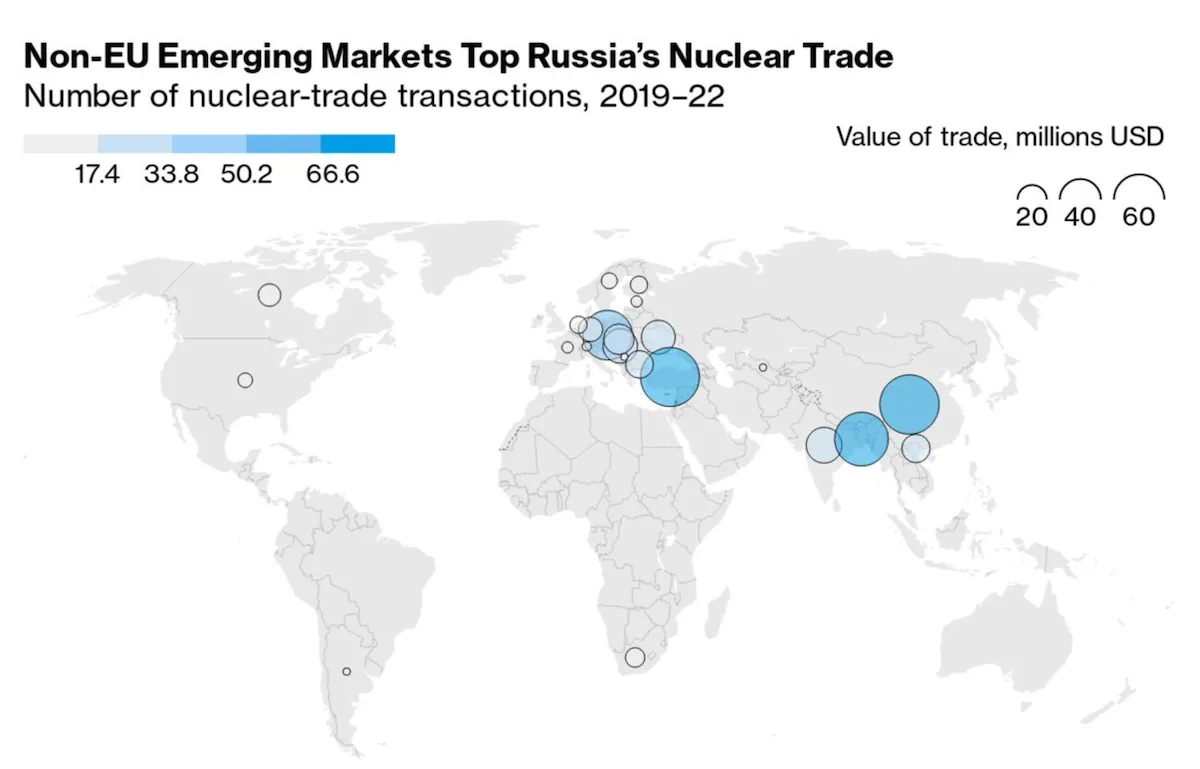 Ринки, що розвиваються, і не є членами ЄС, очолюють ядерну торгівлю з Росією / Інфографіка Bloomberg / RUSI
