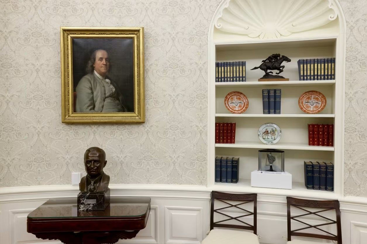 Також в Овальному кабінеті знову з'явився бюст Вінстона Черчилля, котрий стоїть на столі біля каміна на тому самому місці, де його ставив Трамп і під час минулого президентського строку. Одним із незмінних елементів, який був і у Байдена, і у Трампа, є бюст Мартіна Лютера Кінга молодшого. Також новий президент США залишив і портрет Бенджаміна Франкліна. Його повісив Байден, аби підкреслити свою прихильність науці.