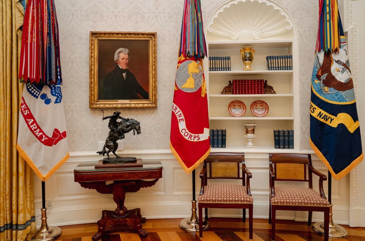 Серед іншого в Овальному кабінеті з'явилися срібні фігурки орлів – національного символу США. Блакитний килим Байдена замінили на нейтральний, а на стіні знову з'явився портрет Ендрю Джексона – сьомого президента США, якого обожнює Трамп.