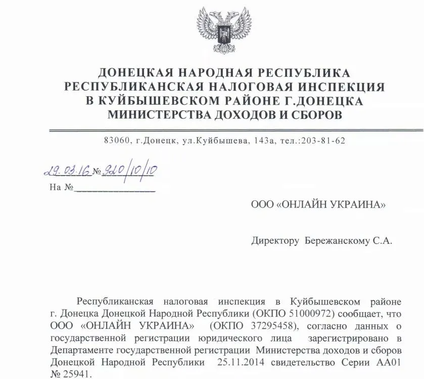 Але надалі було виявлено більш серйозні, юридичні докази зовсім іншого характеру. Виявилось, що у вільному доступі на офіційному сайті onlinedn.ru, який належить російському провайдеру, розміщено взірець типового договору для надання послуг з вказаними реквізитами так званого "центрального республіканського банку ДНР", який розташований на Київському проспекті у місті Донецьк. А ще нам вдалось знайти копію довідки з податкової інспекції так званої "ДНР", в якій офіційно підтверджується реєстрація інтернет-провайдера "Онлайн-Україна" у Куйбишевському районі міста Донецьк.