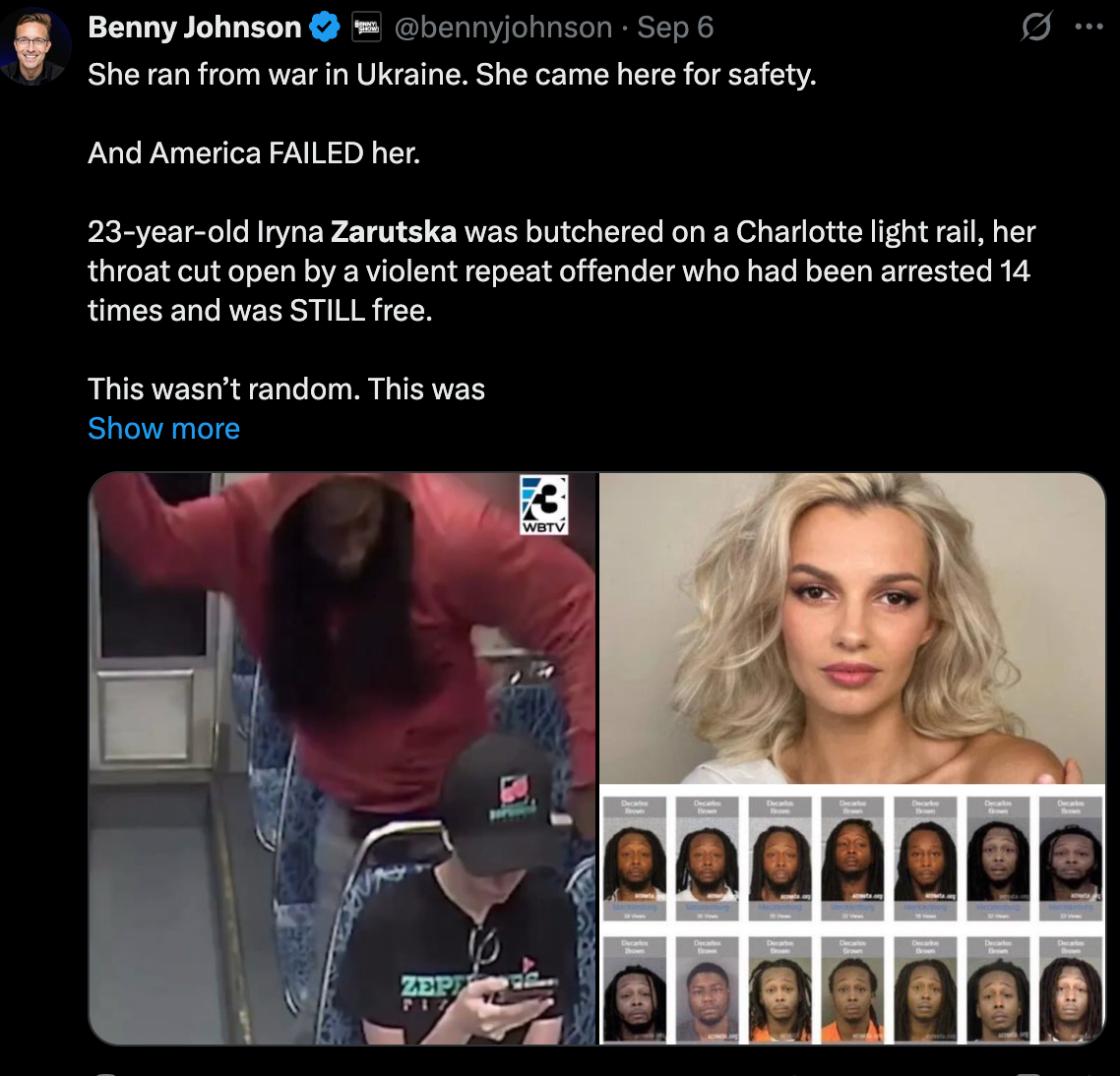 "Директор ФБР Каш Патель повідомив, що агентство розслідує жорстоке вбивство ножем української біженки Ірини Заруцької в поїзді в Шарлотті з моменту інциденту, закликаючи громадськість "стежити за розвитком подій" у цій гучній справі", – йдеться у повідомленні.